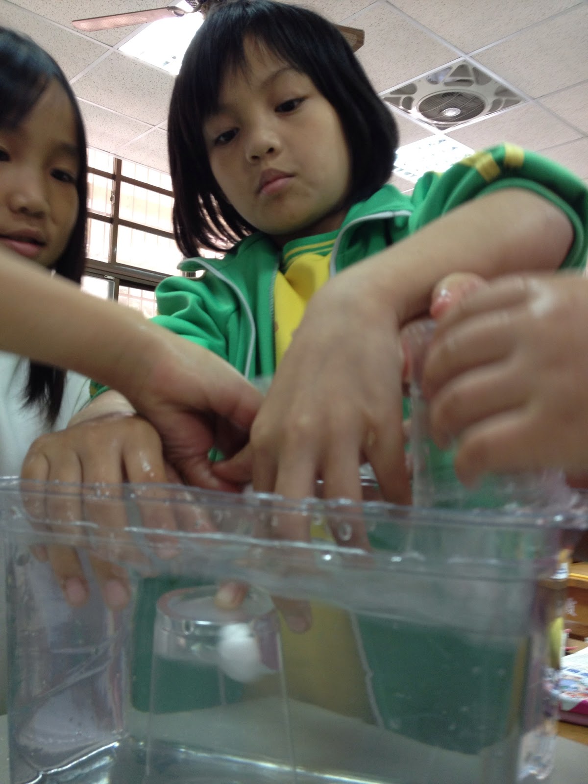 自然課時,我們做了關於空氣佔有空間的實驗。當同學看到杯子裏的衛生紙竟然從水中拿出來還是乾的,大家都連連驚呼--怎麼會這樣!了解其中的道理以後,大家就輪流向魔術師一樣上台「變戲法」。最後換茜茜也學我們上台露(ㄌㄡˋ)一手,結果我們故意騙她把杯子傾(ㄑㄧㄥ)斜,害她的戲法破功了,真好笑。